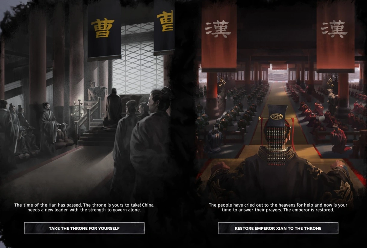 The Han Empire can be restored if the player owns the Fates Divided DLC. This can be done by any faction which controls Emperor Xian and becomes the first person to gain the rank of King. This faction is granted two options: declare themselves Emperor or restore Emperor Xian to the throne. This choice is given only once and the decision is irrevokable. If the faction chooses to restore the Empire, their name will change to Han Empire, they will adopt the Han Flag, and Liu Xie (Emperor Xian) becomes the ruler of the restored Empire.