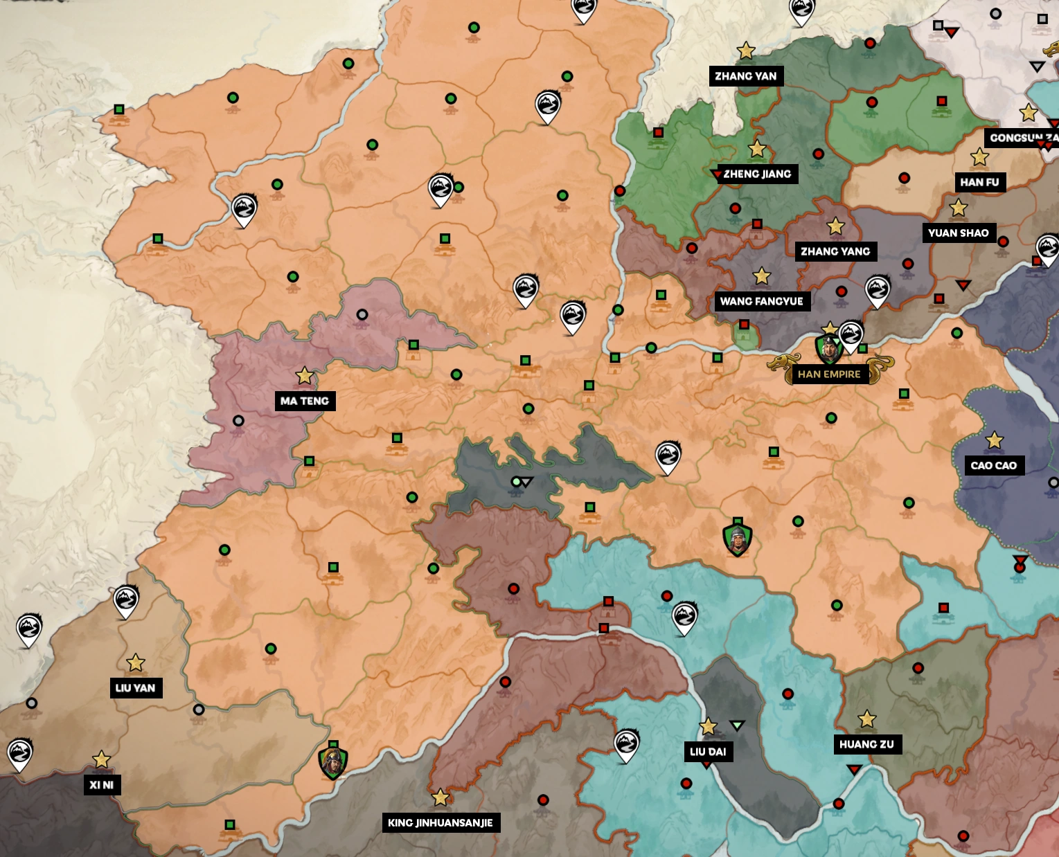 The Han Empire, while easily the largest faction at the start of the game, the faction is passive and does not tend to raise armies to defend itself, and comes under attack from all sides. Oftentimes, it is better to annex parts of the Empire instead of leaving it as a weakened shell of its former glory. The faction that controls Emperor Xian can annex Han settlements at a small cost, transferring the county into their faction without bloodshed. Controlling Emperor Xian in the early game can be somewhat profitable as the vassalised Han Empire offers a strong economy and the ability to annex its territories at a small cost, this advantage can be used for early expansion as the Han becomes an insignificant rump state over time.
