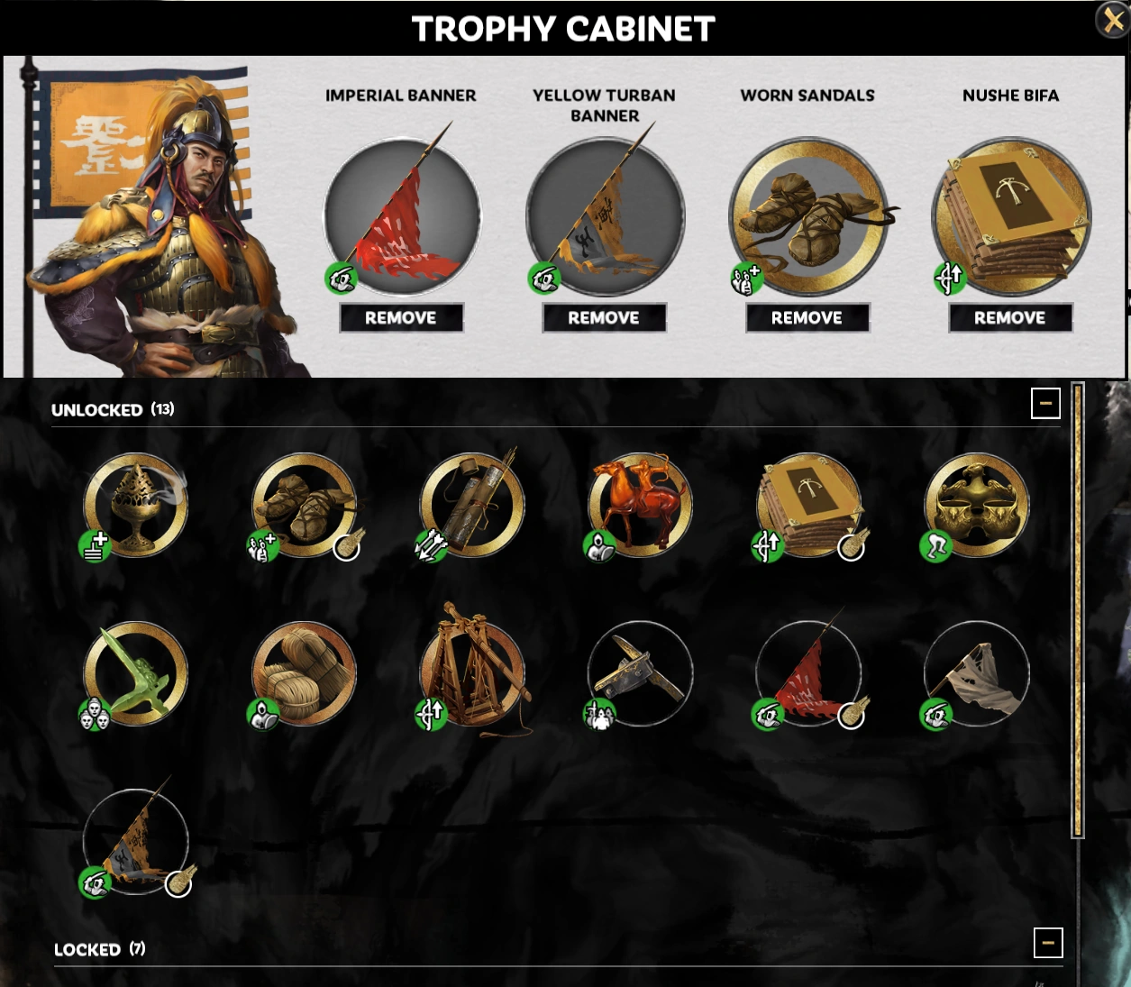 Besides his faction resource, the trophy cabinet is Liu Chong's unique feature. Throughout the campaign, Liu Chong can complete a multitude of challenges that unlock trophies for him that provide boosts once equipped. He can equip up to four trophies at once. In total, there are 20 trophies that can be collected. Below is a list of all trophies.