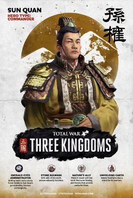 Sun Quan is a unique legendary Commander hero in Total War: Three Kingdoms. He is the son of Sun Jian and a member of his faction in 182 and 190, later serving as the heir of his brother Sun Ce in 194 and 200. He is a child in the earlier start dates, only coming of age in 200 AD.