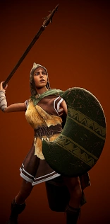 Shorter and lighter than a thrusting spear, the javelin could be thrown at an opponent from a great distance or wielded to great effect in narrow quarters. When use in conjunction with a figure-eight shield, it enabled its wielder to strike at an enemy from the safety of cover. The weapon, crafted from a wooden shaft and tipped with sharpened bronze, came in a variety of sizes and weights, depending on whether it was intended for use in melee combat or flung from afar.