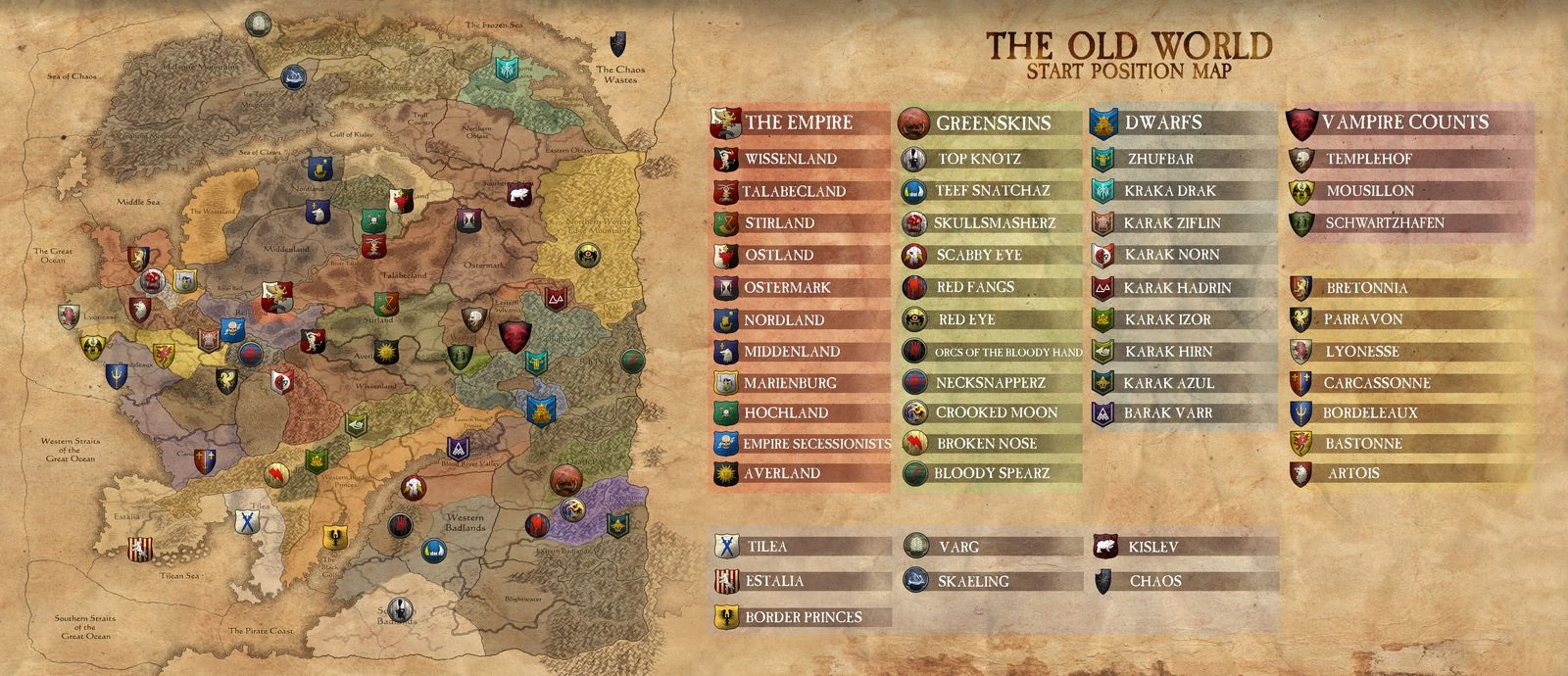 The game begins with the ascension of Karl Franz as the newly elected Emperor of the Empire and the recent turmoil that has occurred with a civil war uprising and the counts of the empire resenting his rule. His task is to unite his fractured kingdom and assert his dominion before challenging the other realms surrounding them and bring peace to the Old World. This peace is challenged by the eternal grudge of the Dwarfs towards the savage Greenskins, and the Vampires ruled by the Von Carsteins in far-flung Sylvania attempting to lead an undead army west and seize the Imperial throne. Yet in the north the Chaos horde rides and seeks to destroy everything in its path corrupting all that stands in its way of domination.