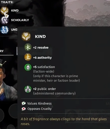 Traits also form the backbone of the Guanxi system, as most traits come coupled with Guanxi modifiers that will influence characters' relations with other characters or their individual behaviour throughout the campaign.