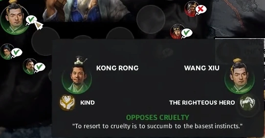 Characters can have opinions on their colleague based on traits. For example, A character with the formidable trait will gain bonuses to their instinct and melee damage and will gain the opinions Commends Physical Strength, Commends Physical Ability, and Supports War. The player can check this on the court screen or on their unit cards. When characters like each other for sharing similar opinions, their relationship is considered harmonious, and a green tick will be displayed. When player's characters are harmonious in court or army, they will become more satisfied with their job and eventually become friends. On the other hand, disharmonious characters will dislike each other and leave the faction if they feel dissatisfied for a long time. Although it is worth noting that disharmonious characters will try to compete with each other on the job, resulting in a slight performance buff.