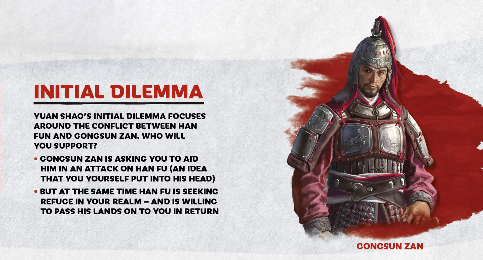 Yuan Shao starts the game in northeastern China. He is an enemy of Dong Zhuo and is at war with the Han Empire. However, after defeating Han general Cui Jun, securing Wei commandery should be of little challenge. However, Yuan Shao stands surrounded by many major factions such as Cao Cao, Gongsun Zan, Zhang Yan and Huang Shao. This leads to a relatively slow start for the faction, as expanding too rapidly will leave you defenseless.